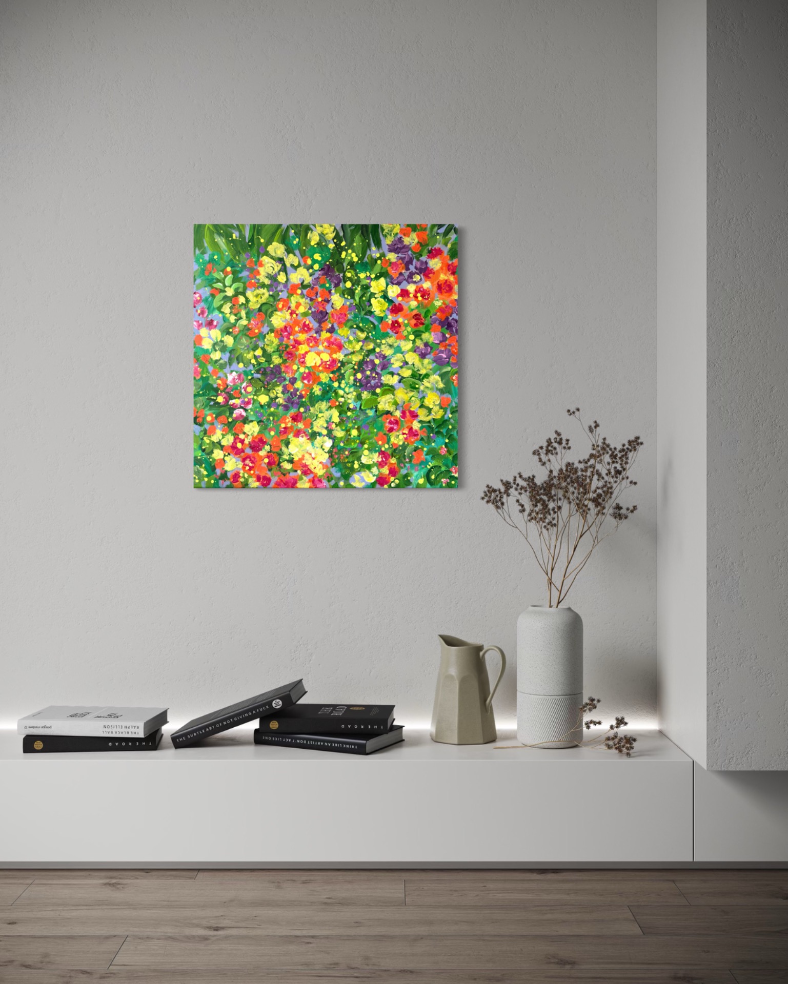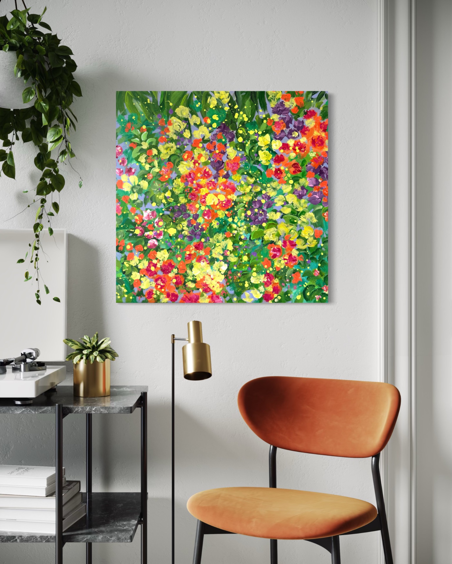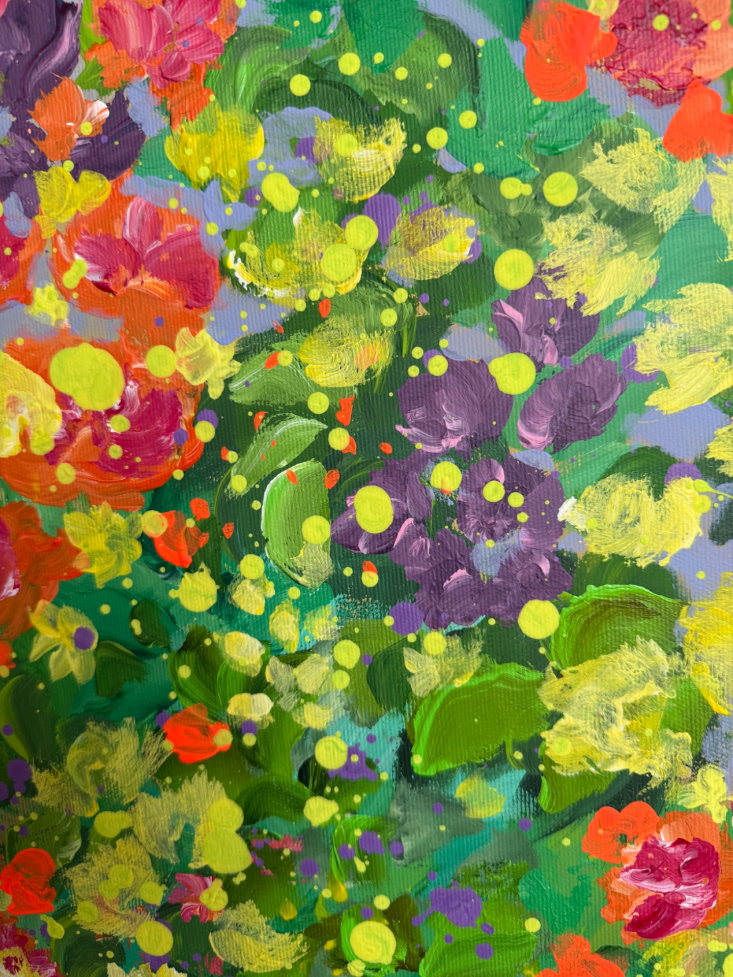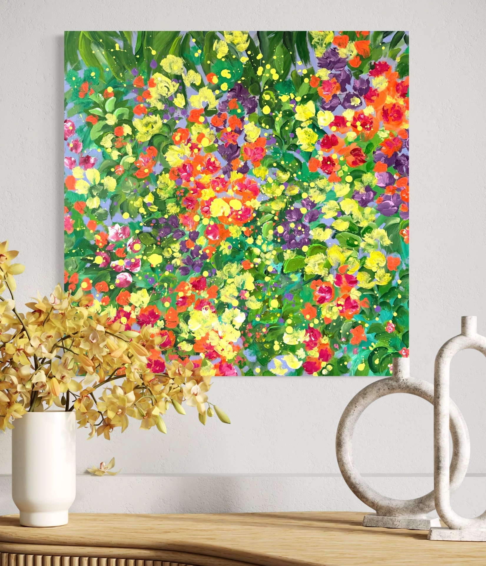 Živý a expresívny obraz sviežej záhrady. Vrstvy zelene objímajú kvety v odtieňoch oranžovej, červenej, fialovej a žltej a vytvárajú radostnú a prírodnú harmóniu.Akrylová maľba na plátneVeľkosť 60x60cm