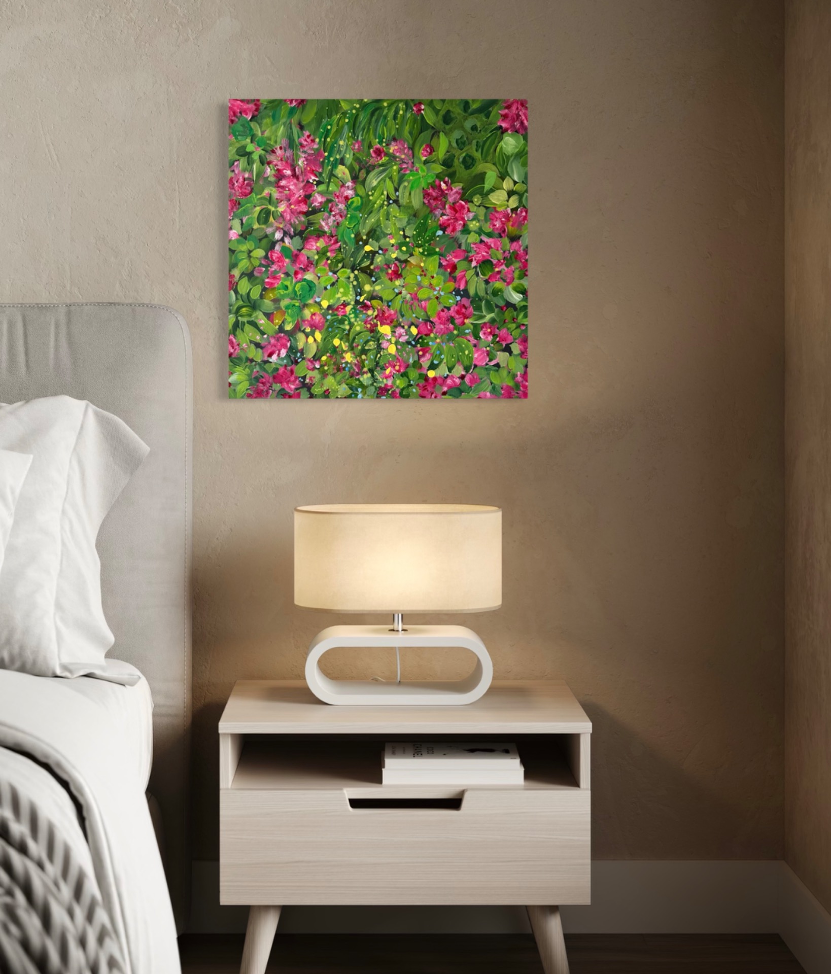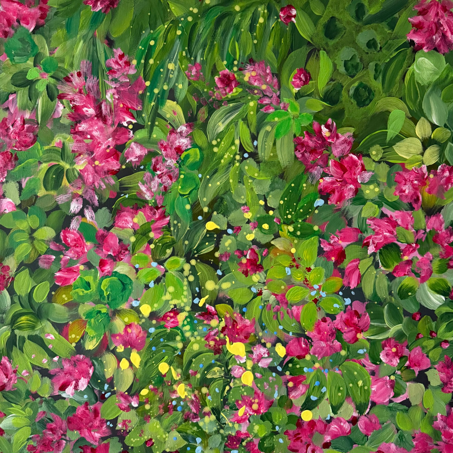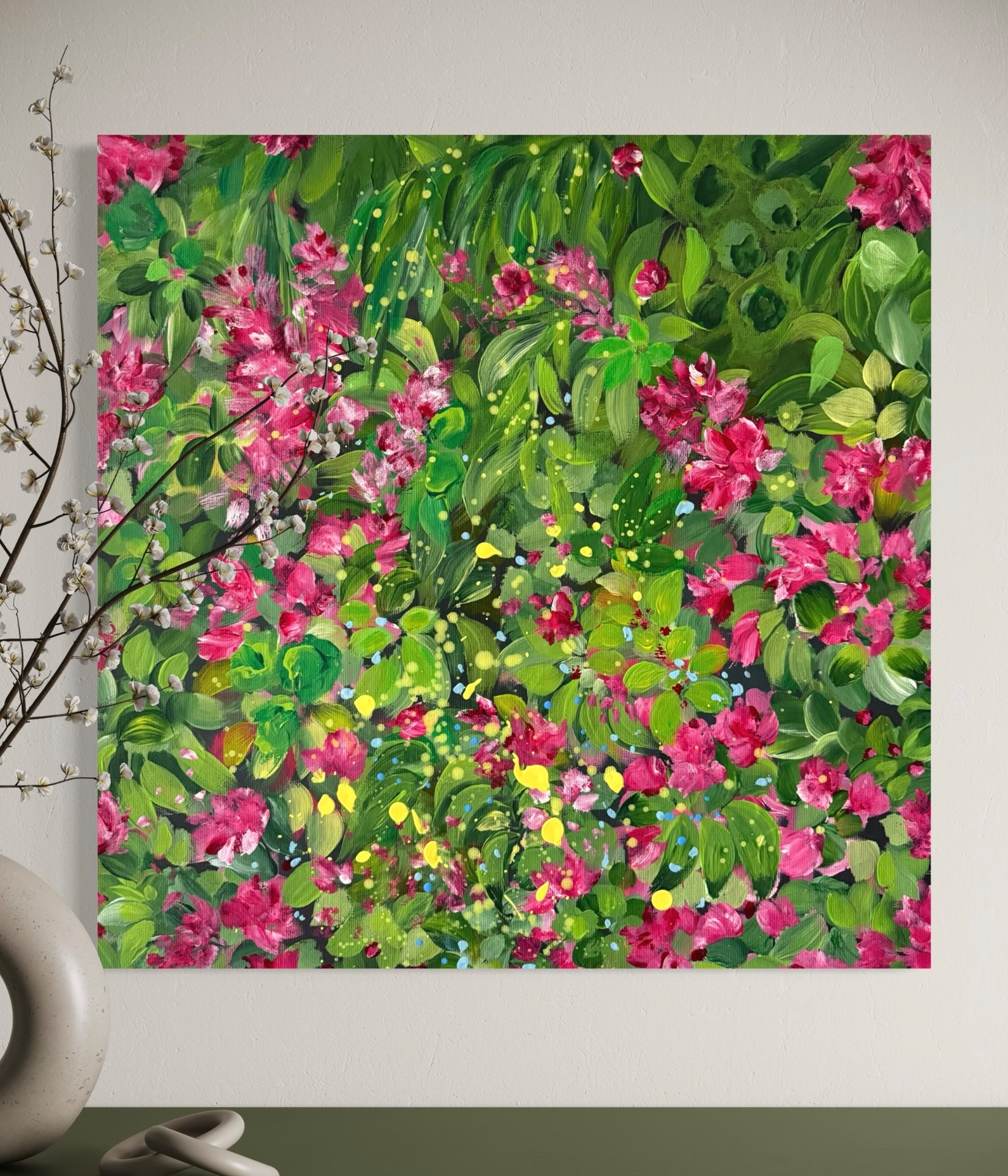 Energická abstrakcia inšpirovaná prírodou, plná žiarivých zelených tónov a kvetinových akcentov v odtieňoch ružovej. Maľba zachytáva živú dynamiku záhrady a prináša pocit vitality a radosti. Je to intuitívne a expresívne dielo, ktoré ponúka divákovi spojenie s energiou prírodného sveta.