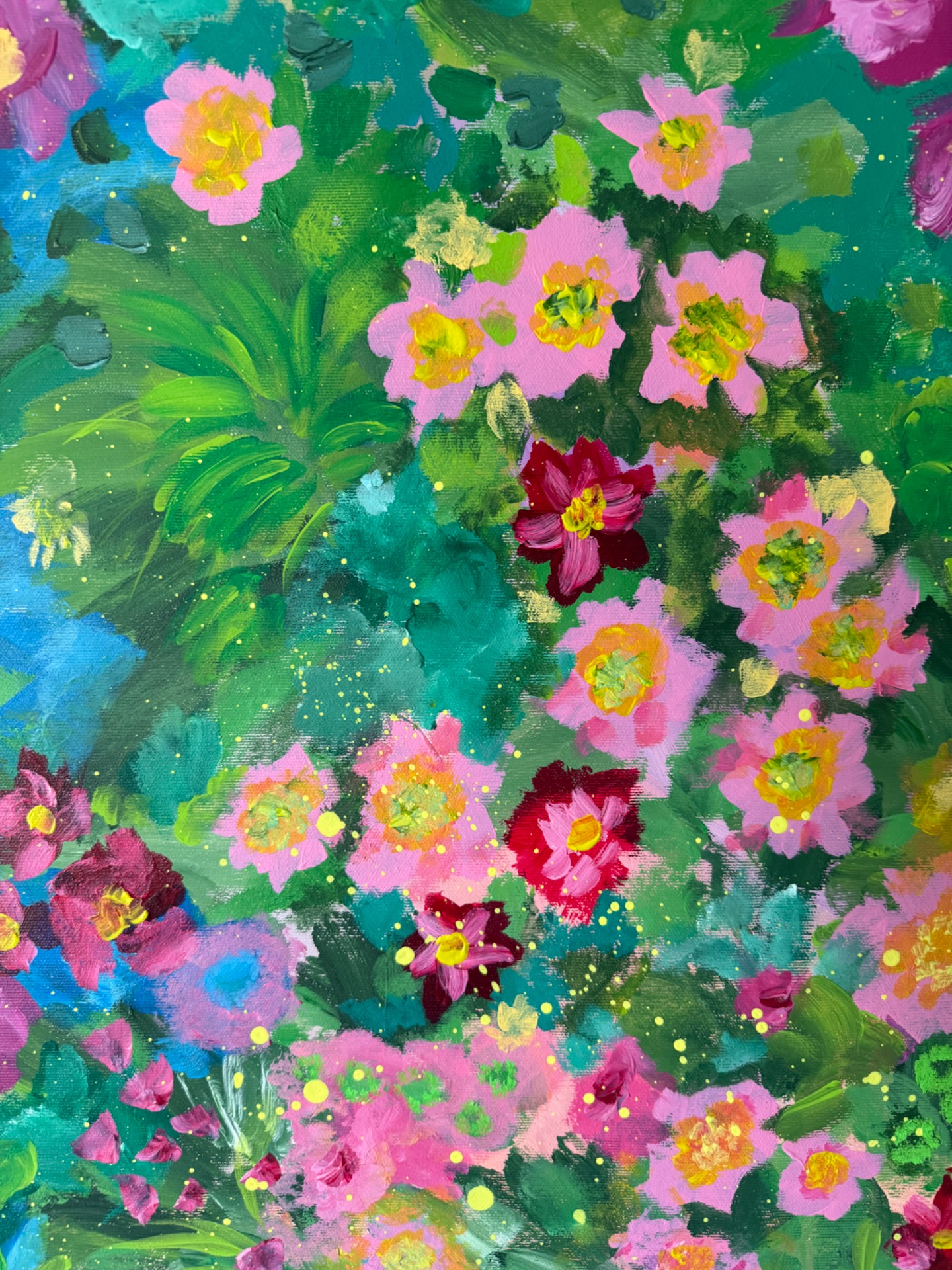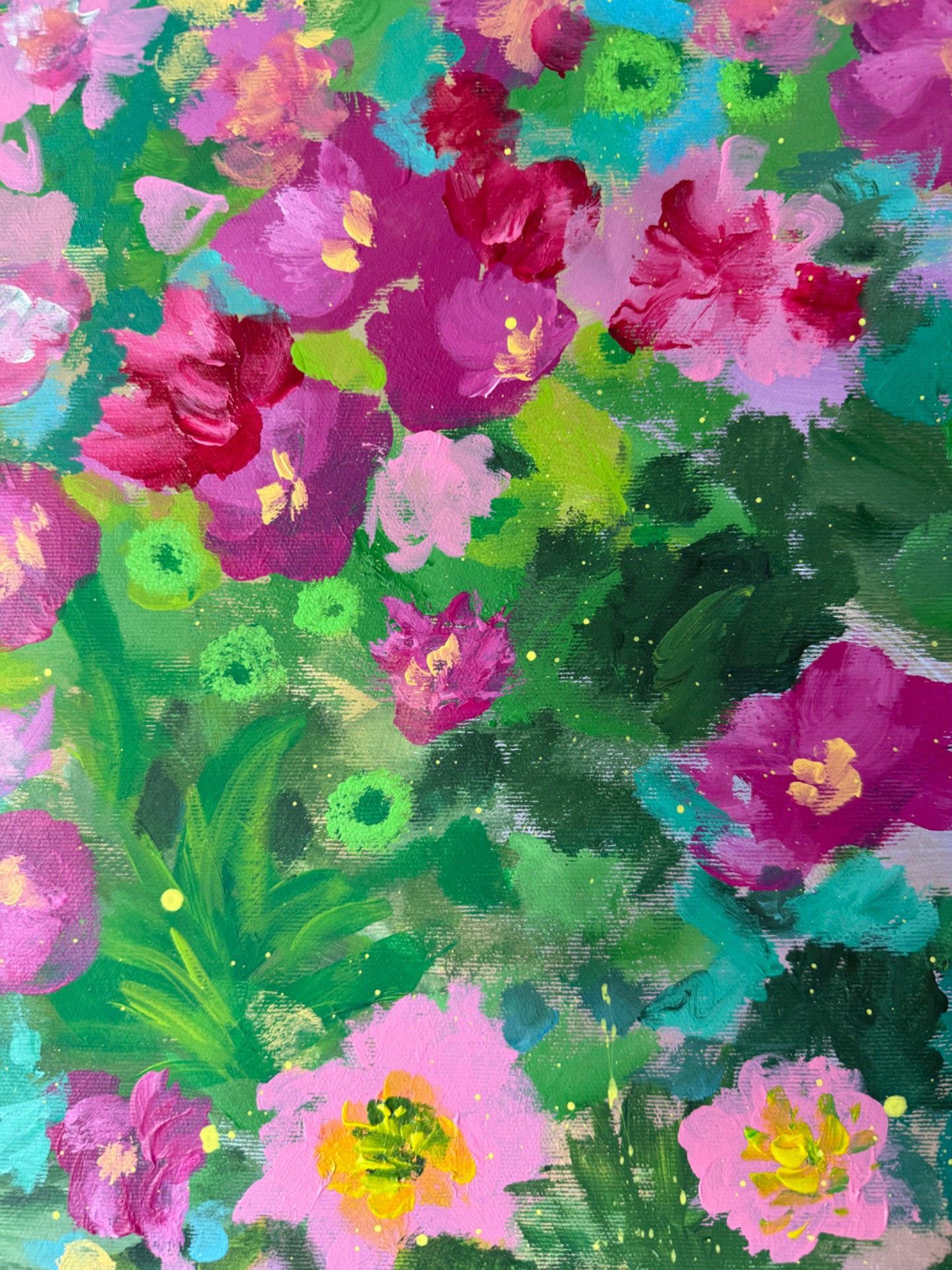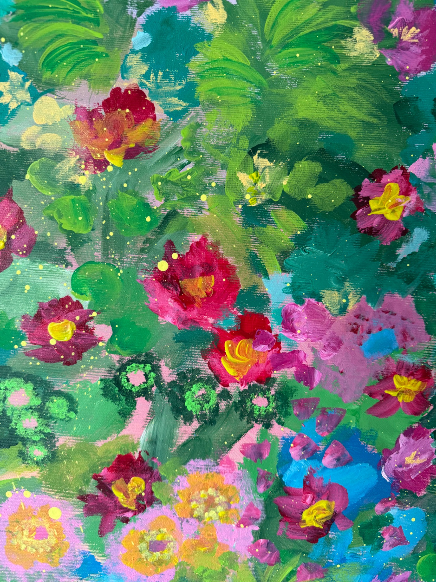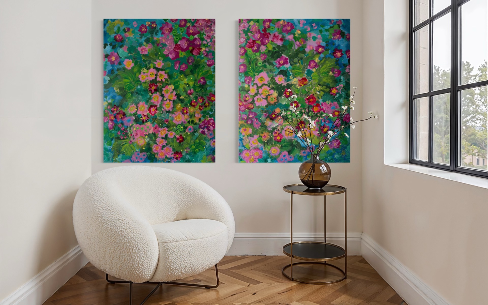 Diptych zložený z dvoch plátien, každé s rozmermi 60 × 80 cm. Spoločne tvoria harmonický celok naplnený farbami a energiou. Kompozícia predstavuje živú zmes kvetinových foriem, ktoré sa navzájom dopĺňajú a prelínajú. Vhodný do moderného aj klasického interiéru.