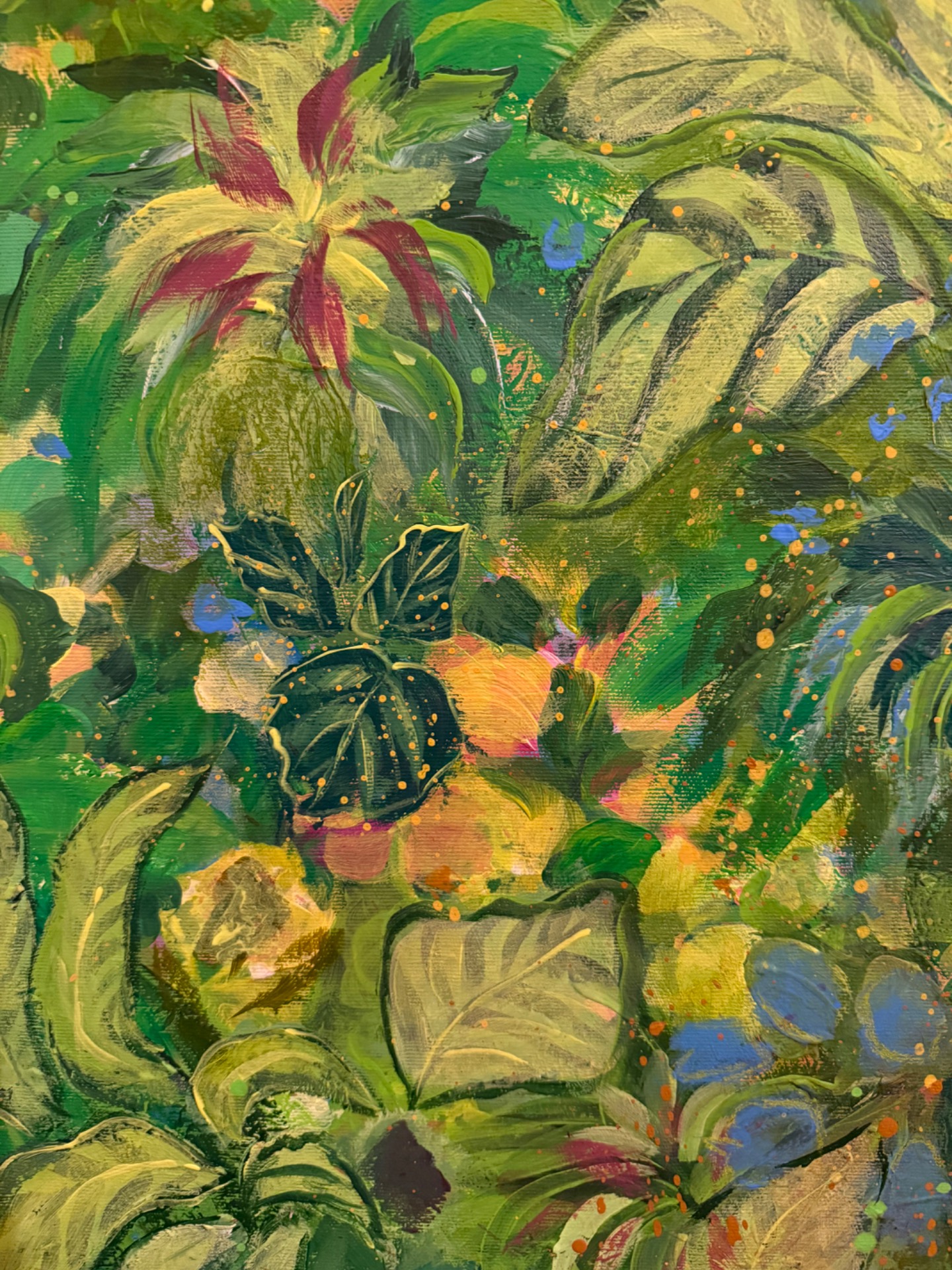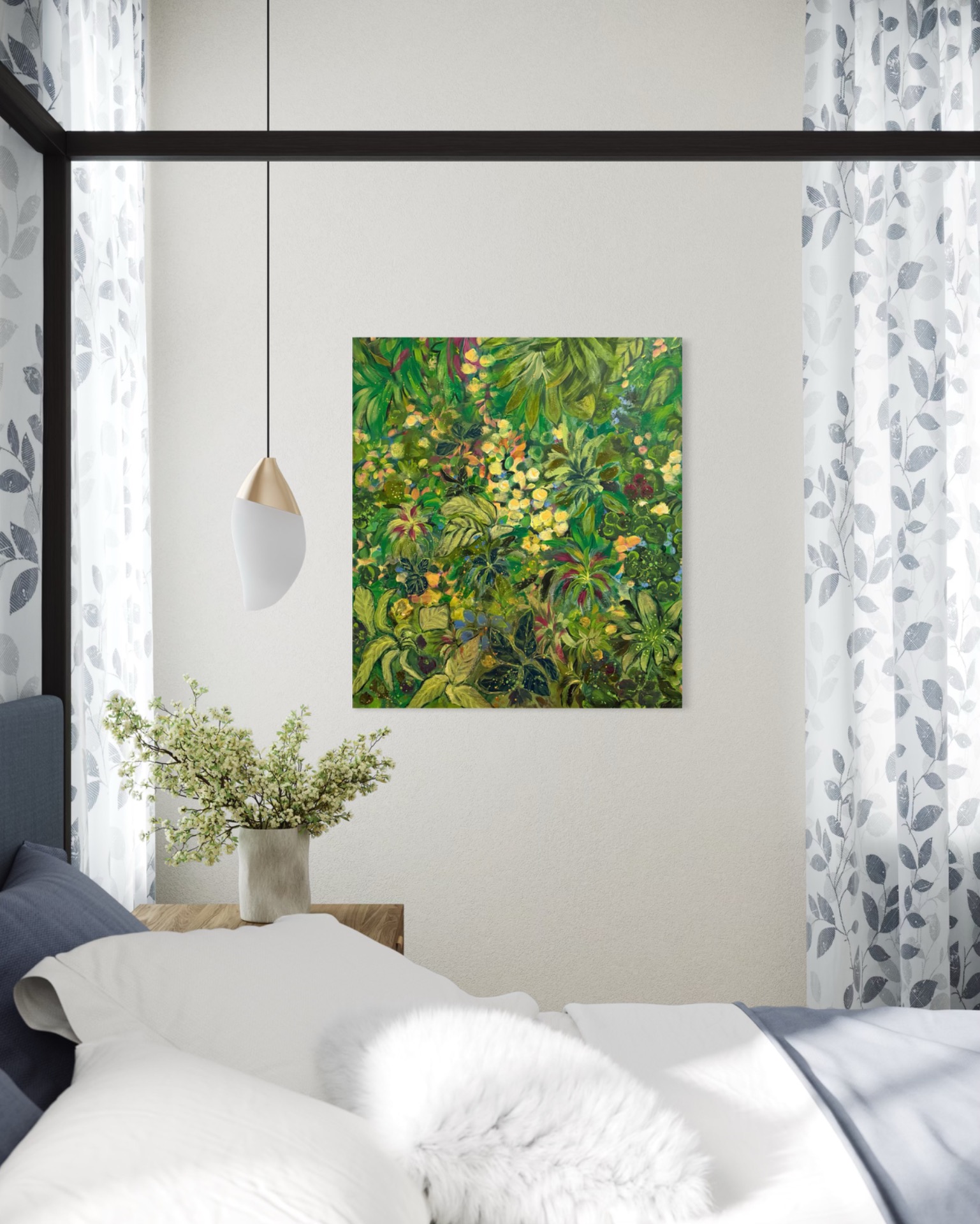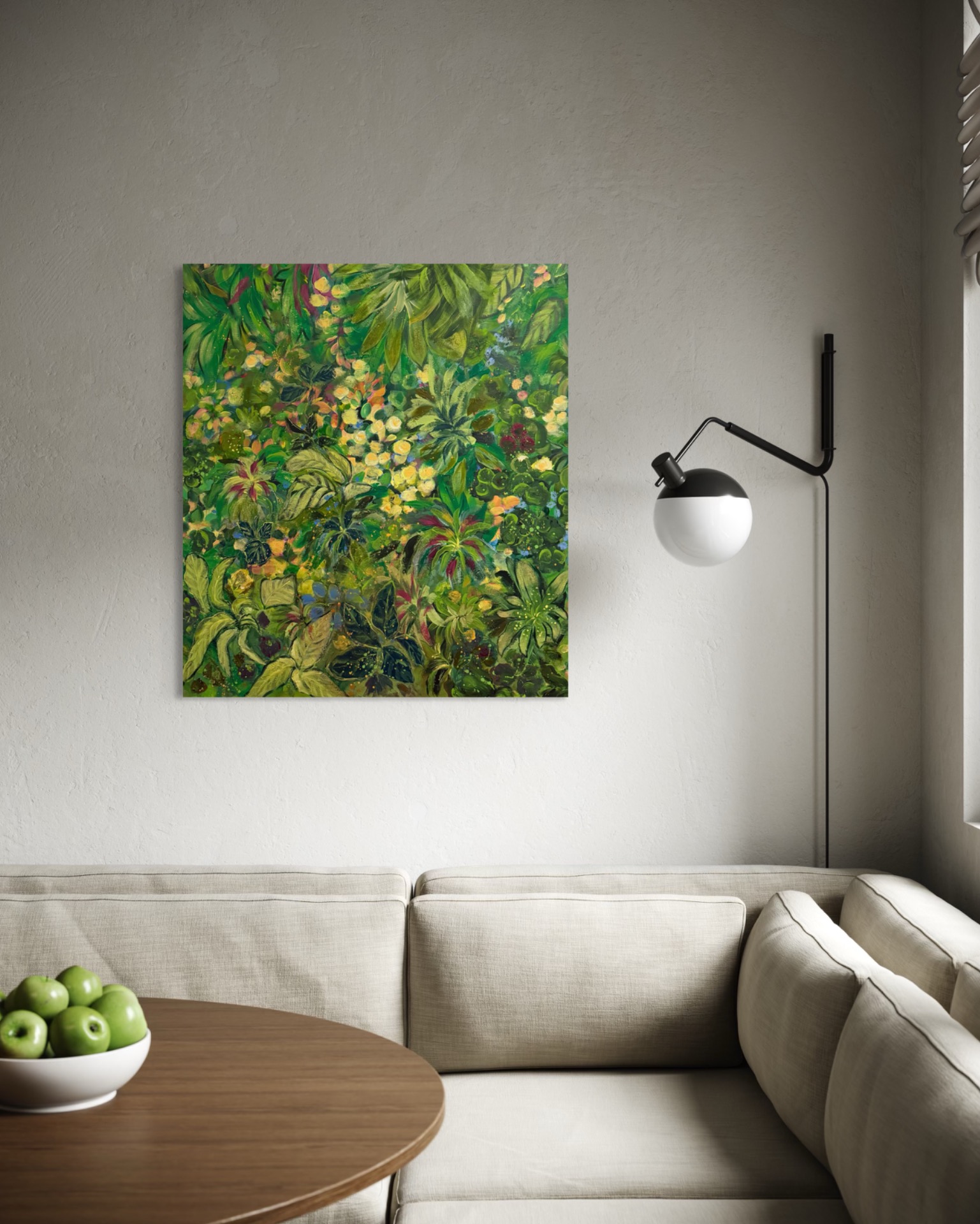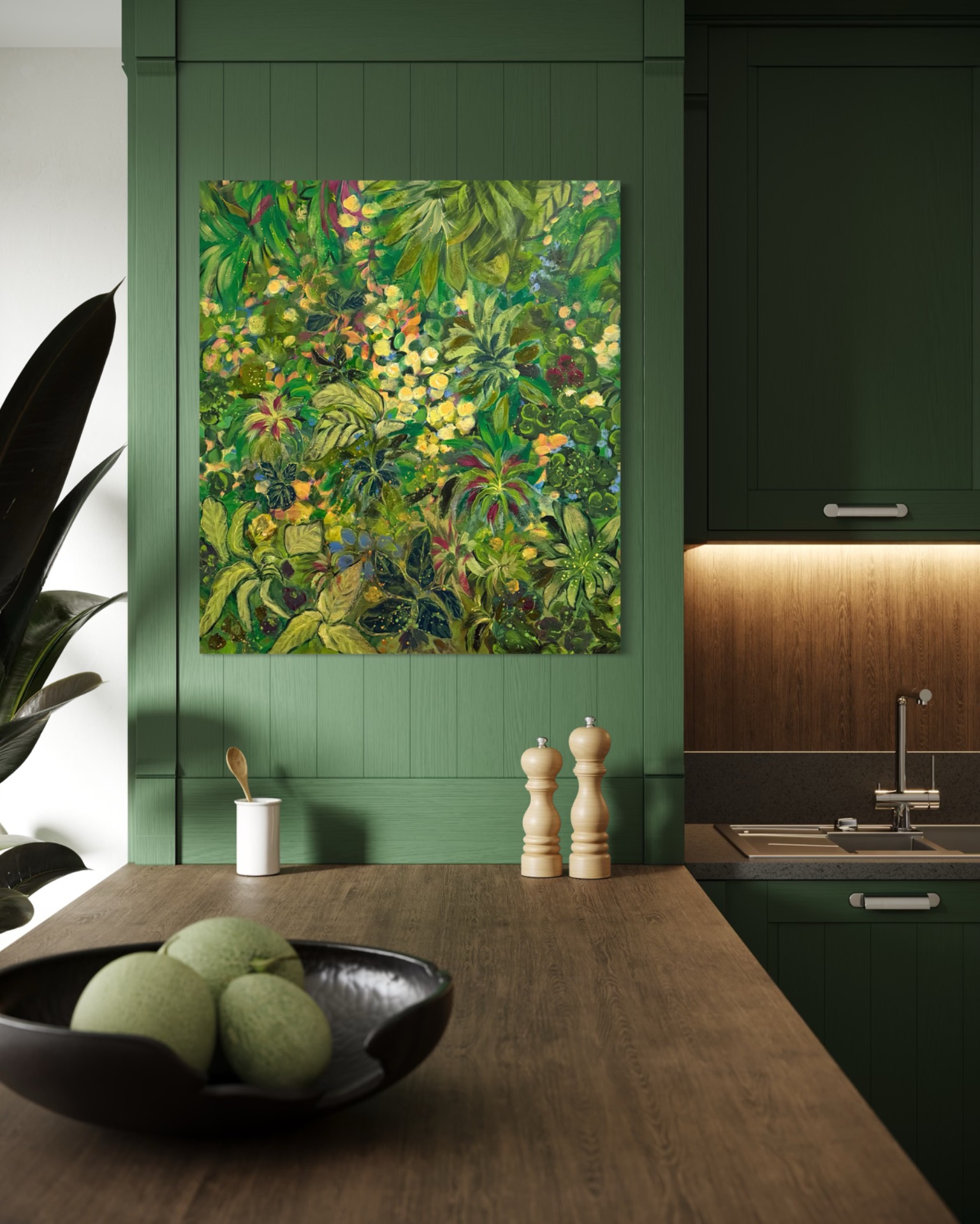 Tropický šepot je bohato sfarbená, vrstvená kompozícia divokej prírody a hojnosti záhrady – okamih zastavený medzi dňom a súmrakom a oslava radosti z pozorovania detailov prírody. Toto dielo vynikne v modernom interiéri alebo ako akcentový kus, kam chcete vniesť pocit zelenej vitality.